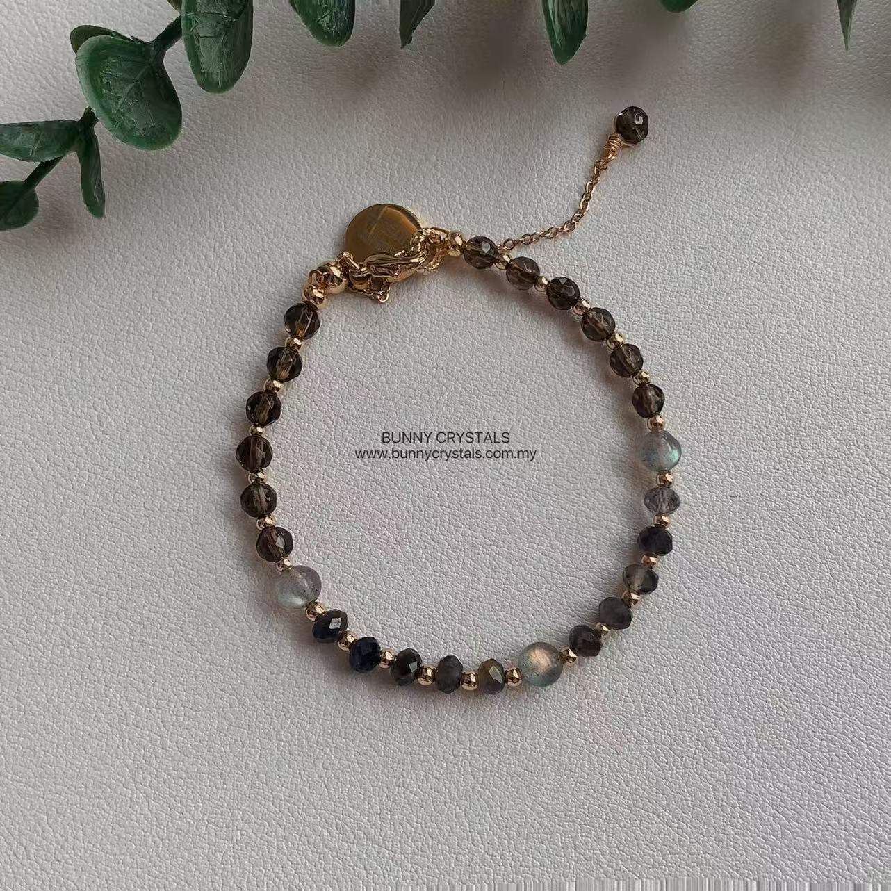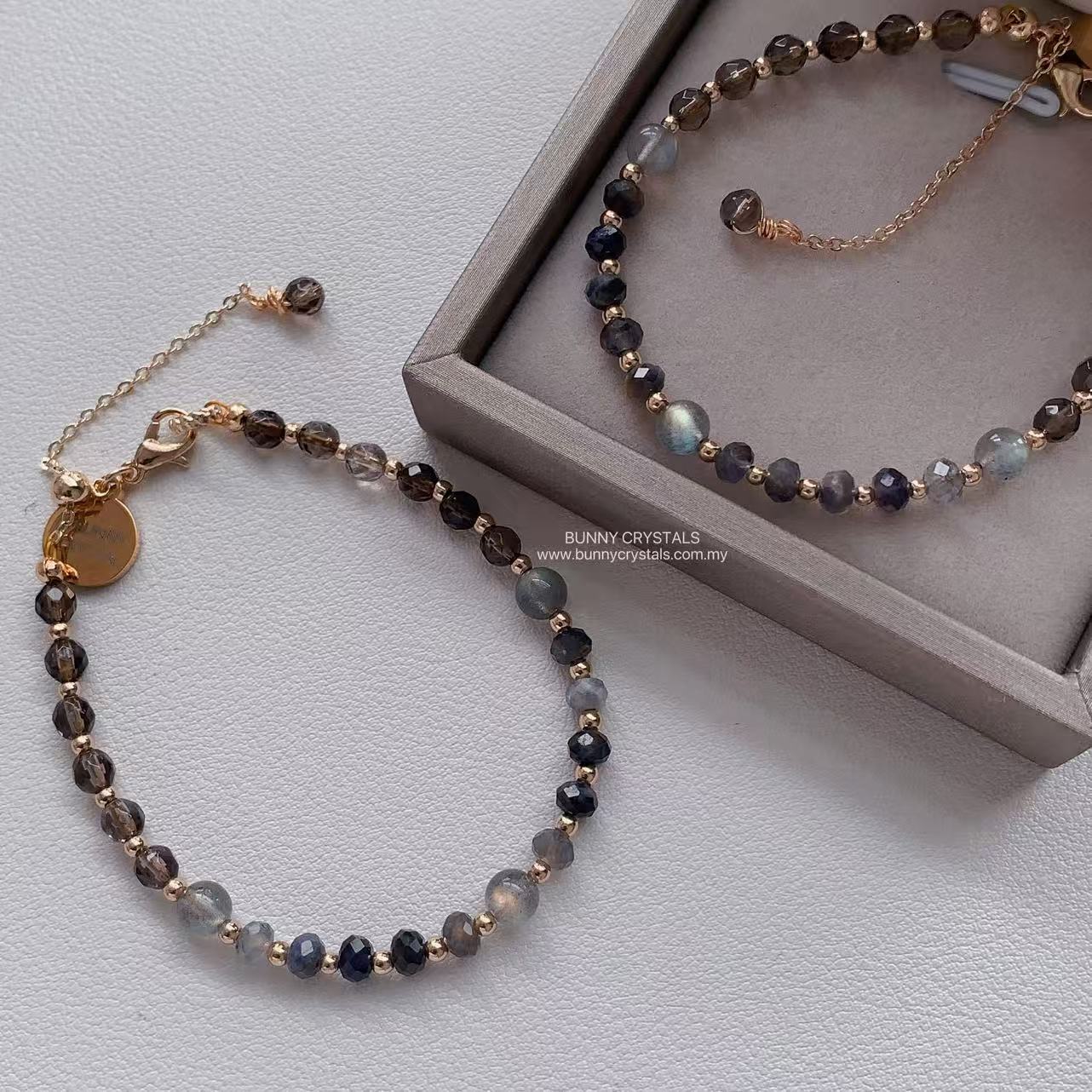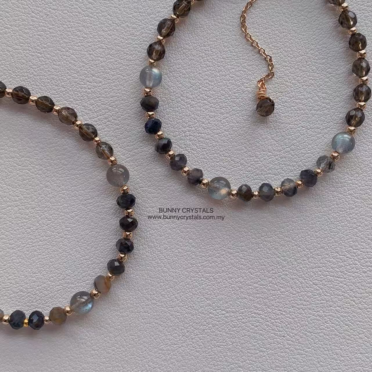 💎 宝石功效 – 堇青石、灰月光石与茶晶手链;